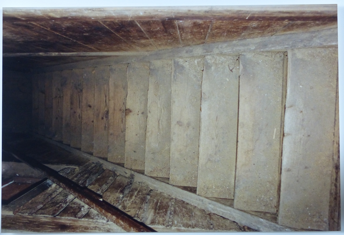 Träsliperiet före renovering. Trappa mellan vind och utställning i södra hörnet.