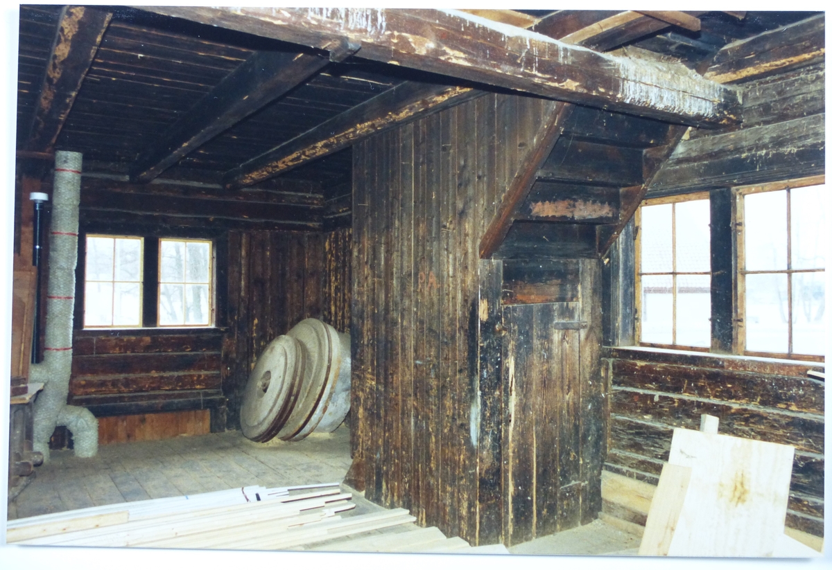 Träsliperiet före renovering. Receptionstak, trappa till vinden, vänstra hörnet.