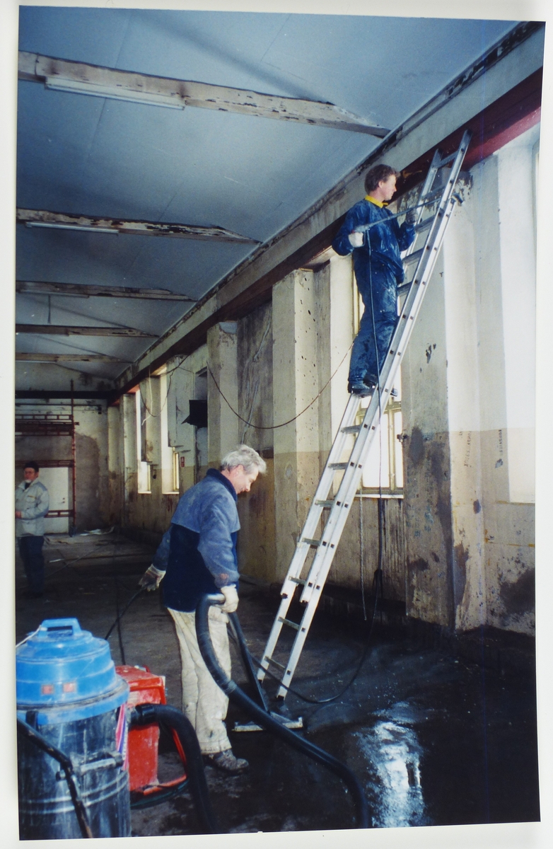 Plåtverkstadn, väggarna högtrycktvättas innan målning.