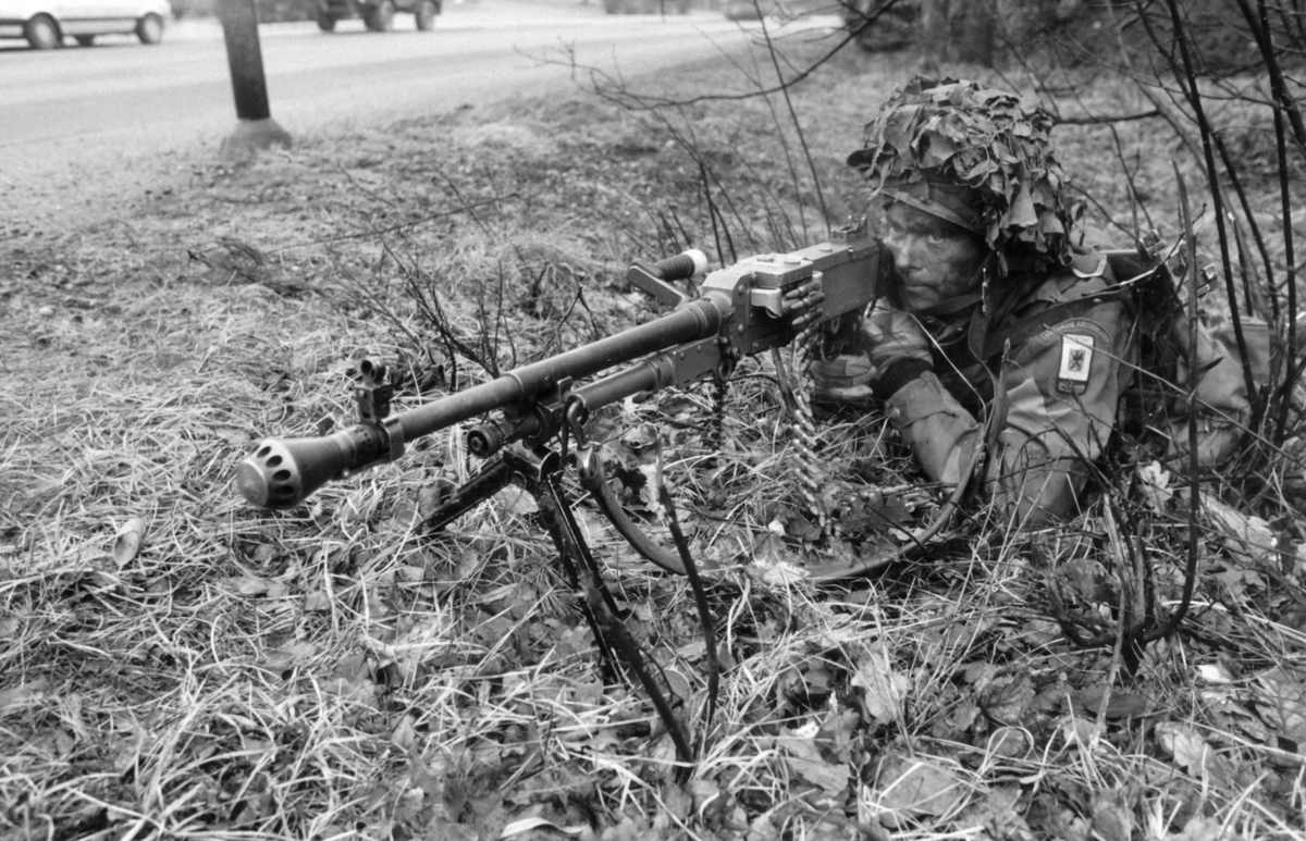 Soldat ur Livkompaniet i eldställning med kulspruta m/58.