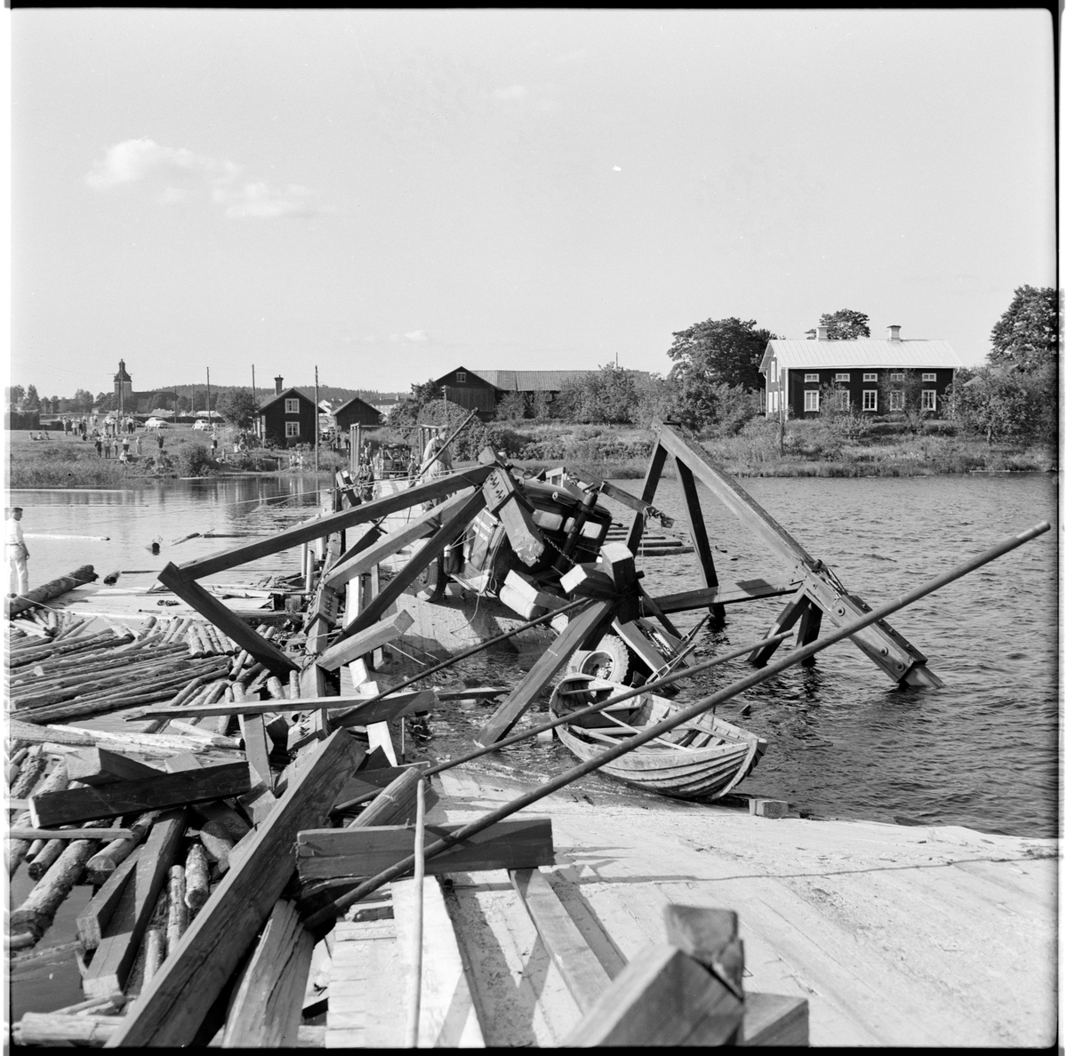 Träbro över Dalälven vid Landa. Flottbro (pontonbro). Sönderkörd av långtradare. Vy från söder. Stora Skedvi kyrka i bakgrunden. Idag länsväg 785 Dalarnas län.