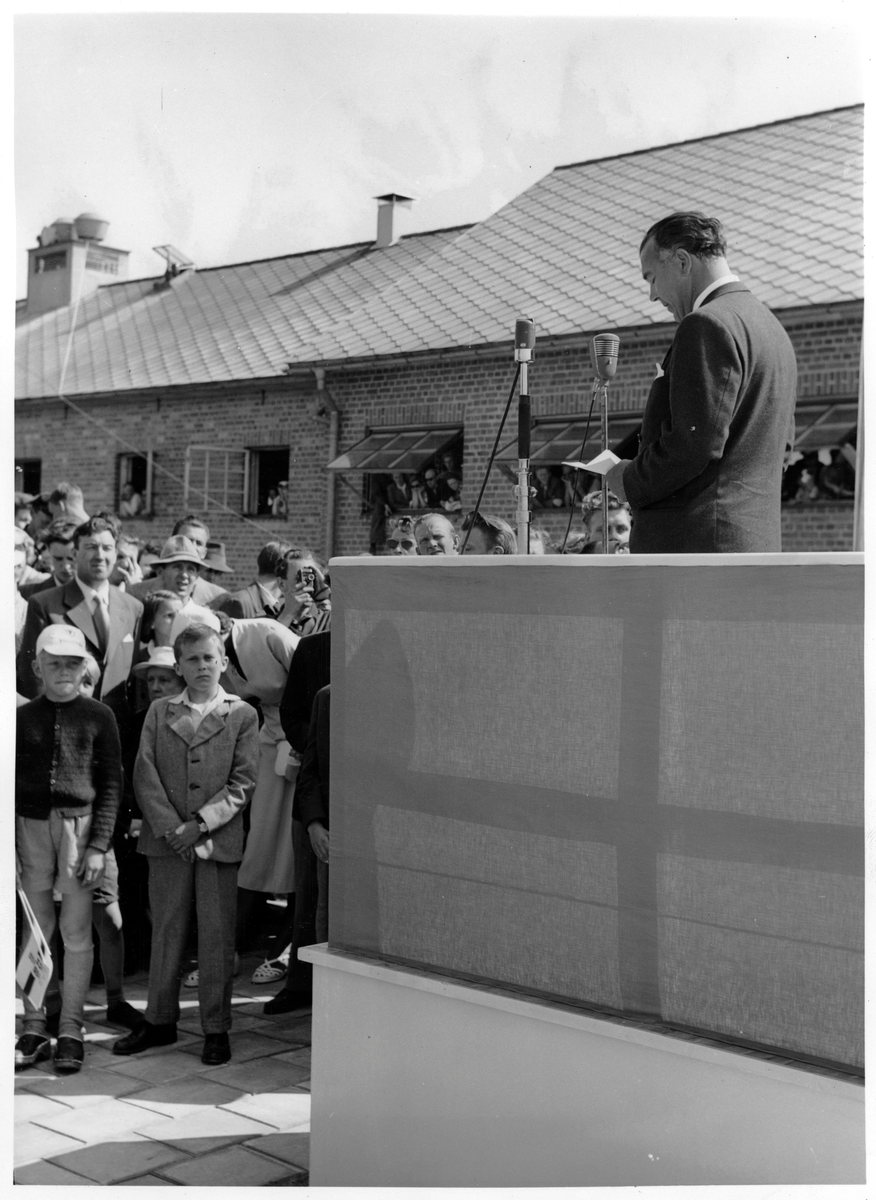 Titel: Invigning av vägbro mellan Bergnäset och Luleå. Hans Kungliga Höghet Prins Bertil talar inför invigningen.