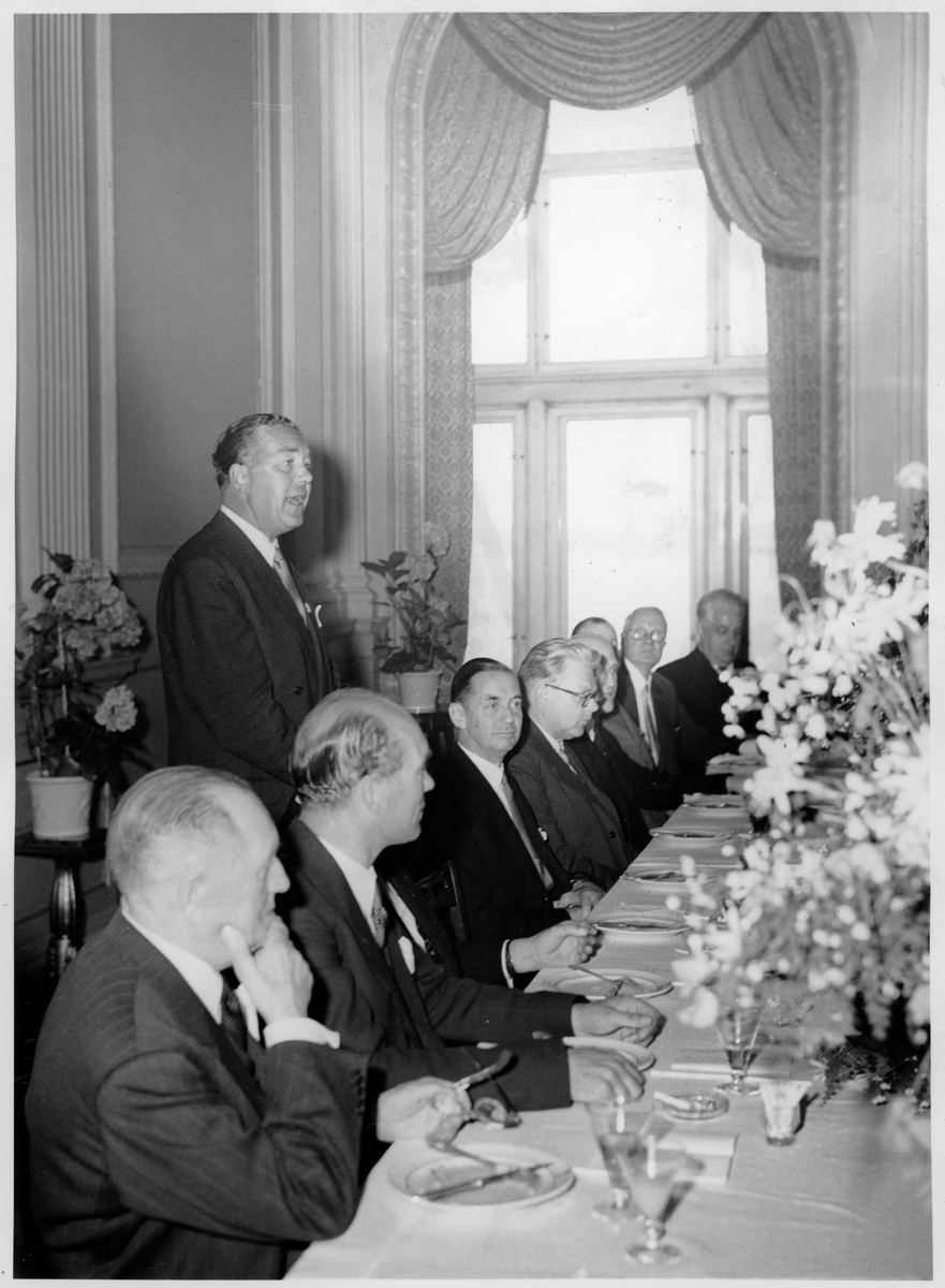 Titel: Invigning av vägbro mellan Bergnäset och Luleå. Hans Kungliga Höghet Prins Bertil håller tal under middagen på invigningen.