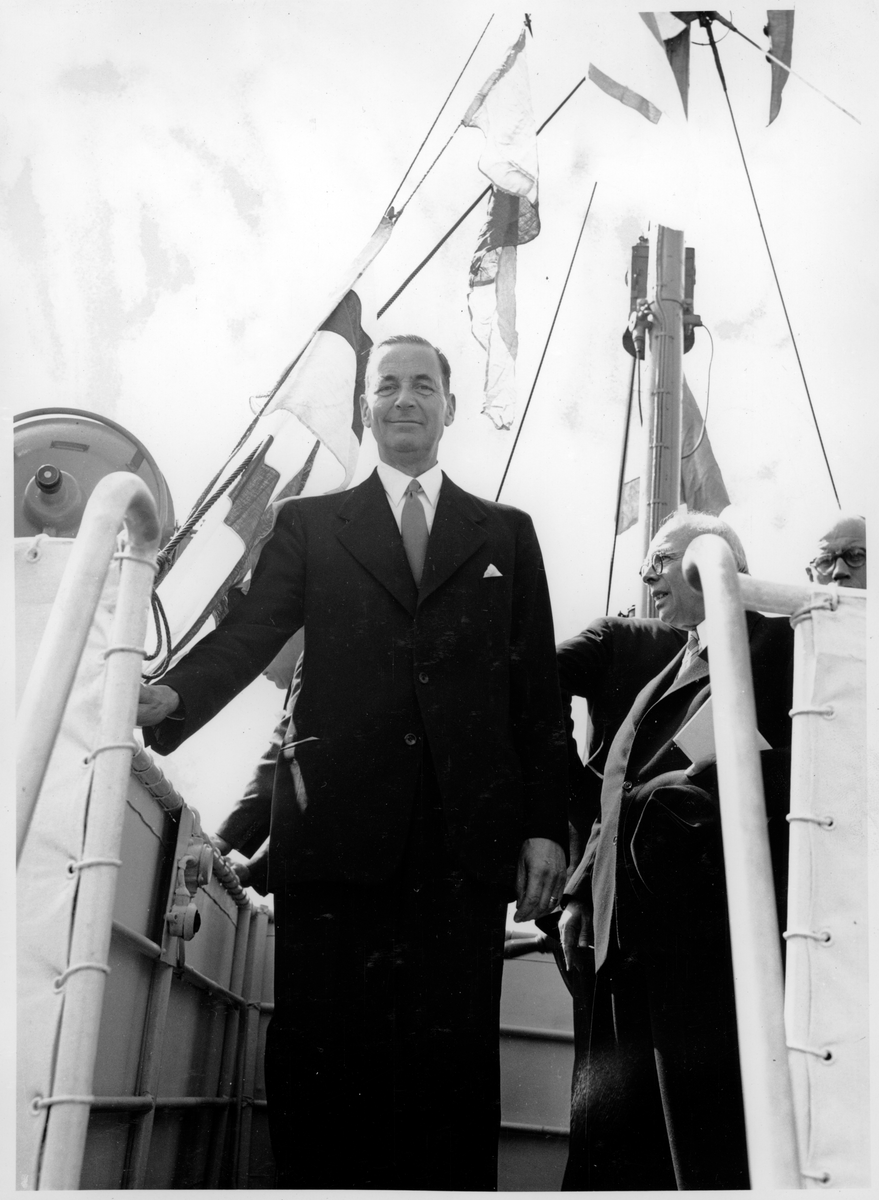 Invigning av vägbro mellan Bergnäset och Luleå. Digniteter på en båt under invigningen.