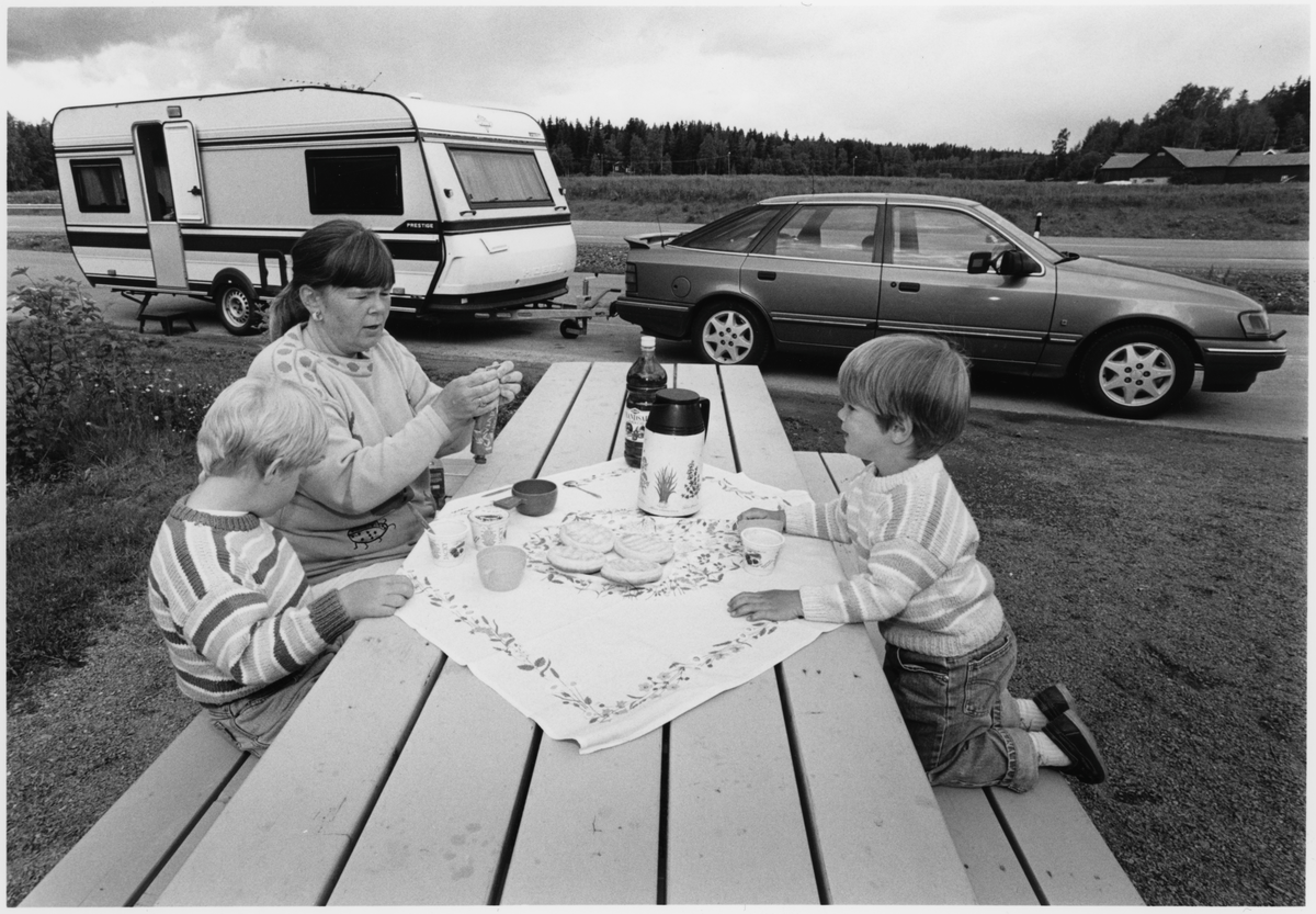 Kvinna med två barn som stannat med bil och husvagn för fika.