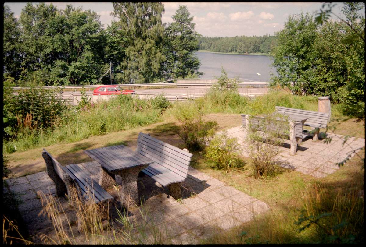 Träbänkar vid Tintomara rastplats med utsikt över Stavsjön. Länsväg 500 Södermanlands län.