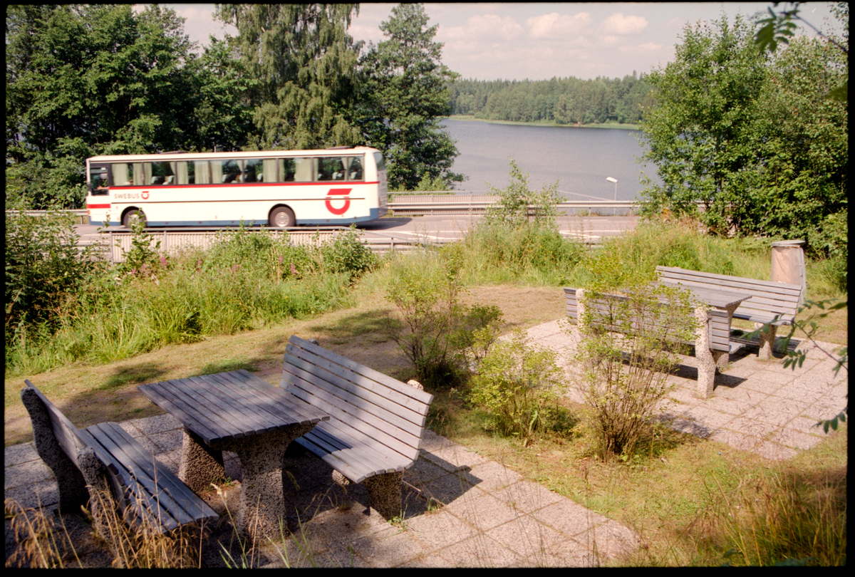 Träbänkar vid Tintomara rastplats med utsikt över Stavsjön. En Swebus-buss i bakgrunden. Länsväg 500 Södermanlands län, utsikt över länsväg 800 Södermanlands län.