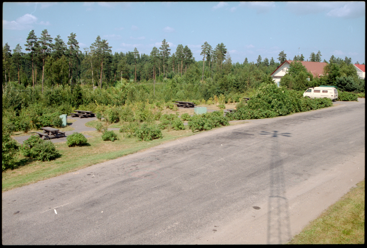 Träbänkar vid Sillekrog rastplats, utmed E4. I angränsning finns vägkrog och bensinstation.