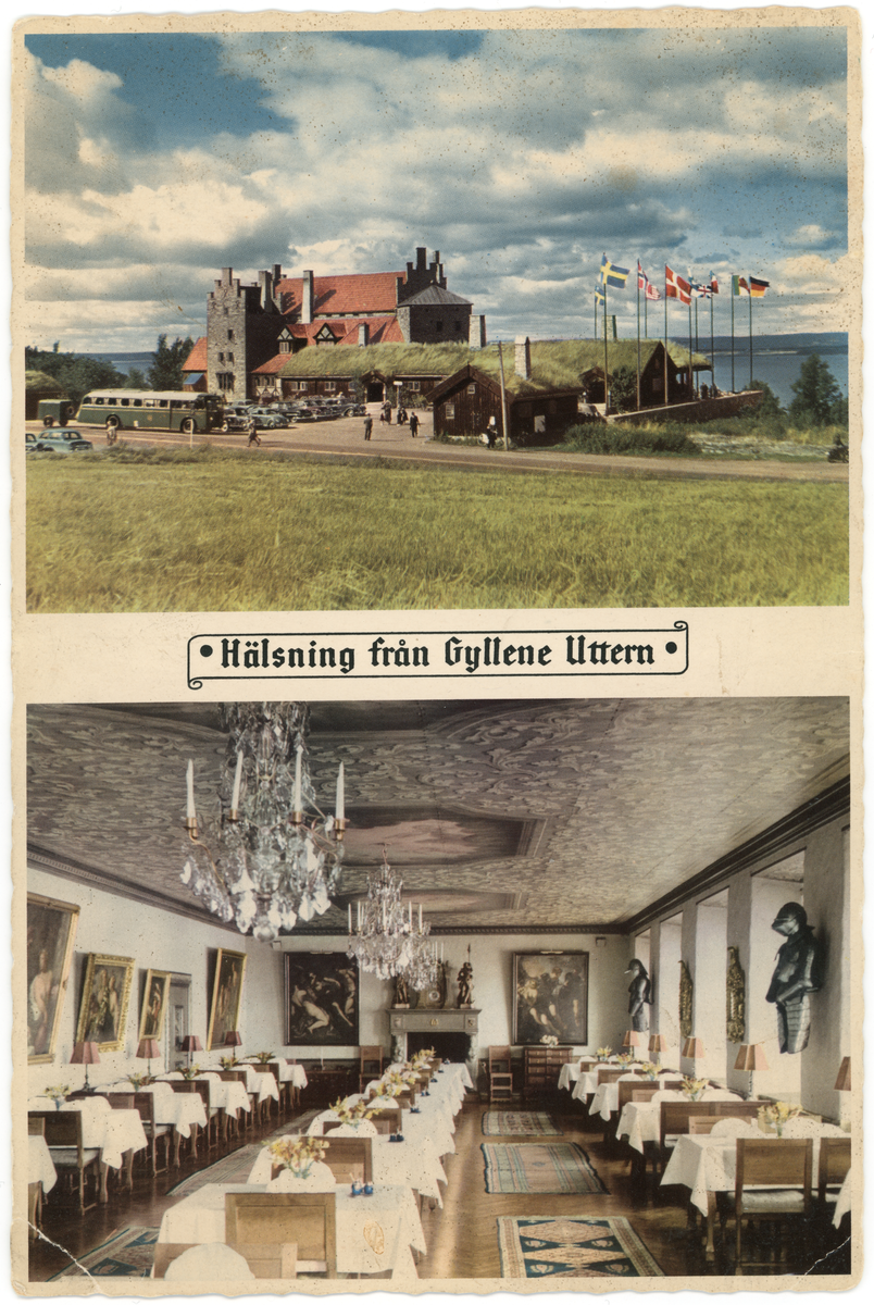 Vykort av Gyllene Uttern. "Hälsning från Gyllene Uttern". Länsväg 993 Jönköpings län.
