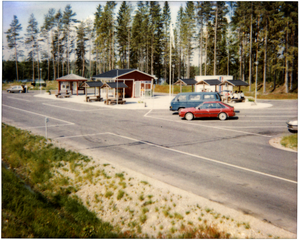 Rastplats med sittplatser, toalett och telefonkiosk.