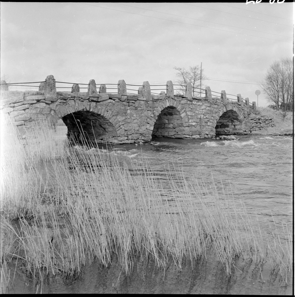 Stenvalvsbro över Rolfsån, Hanhals. Järnräcke med stengardister. Länsväg 939 Hallands län.