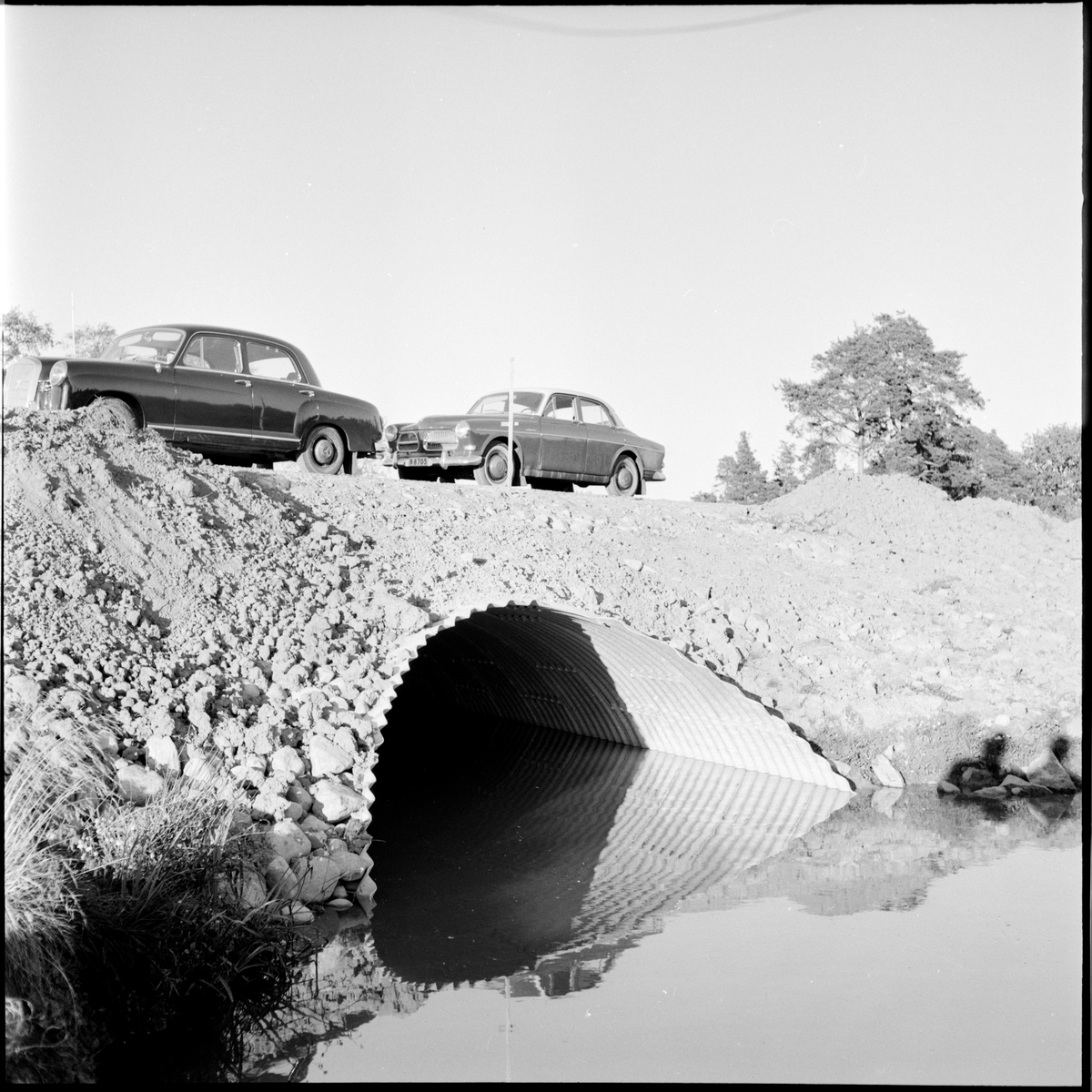Vägtrumma i plåt. Bil registrerad i Skaraborgs län (Västergötland).