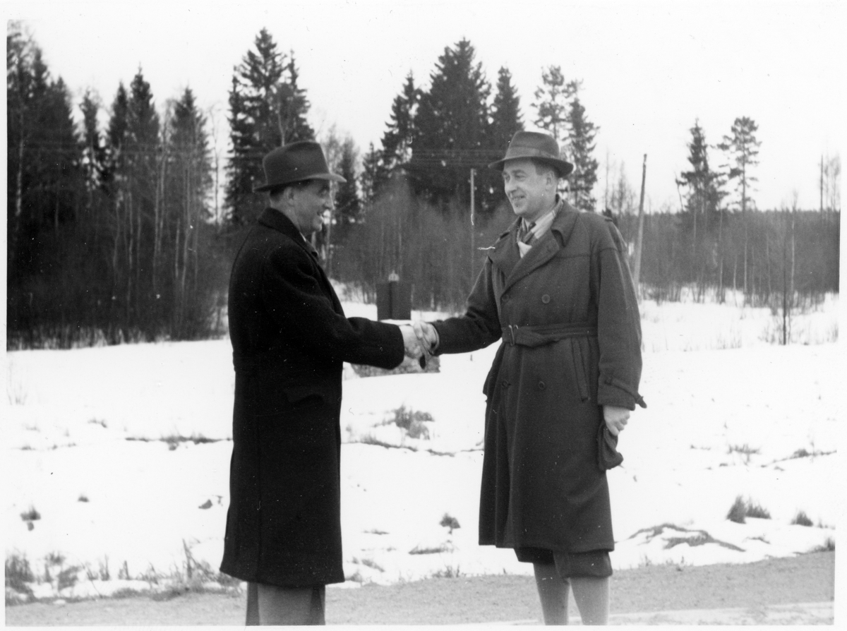 Vägdirektör Sten G. Ohlson och Vägdirektör Assar Nordin, vid länsgränsen Örebro - Arboga. Länsgränsmärke i bakgrunden. Idag Länsväg 572 Västmanlands län.