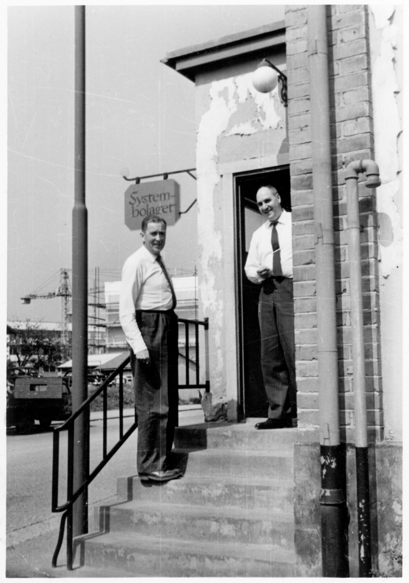 Två män står på en trappa till Systembolaget.