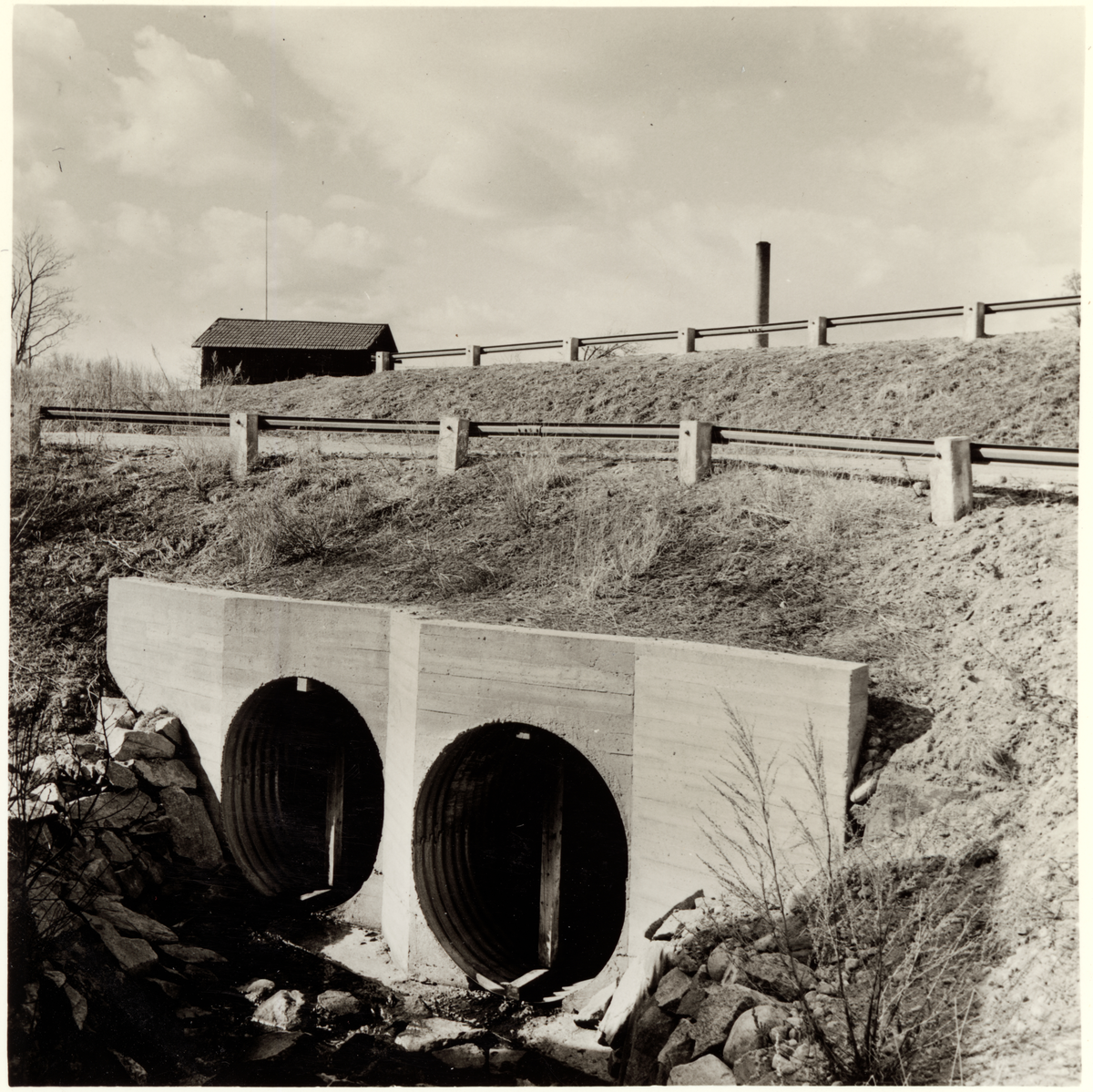 Vägtrummor i betong och plåt. Vy nedströms. Vägräcken med betonggardister. Länsväg 765 Dalarnas län.