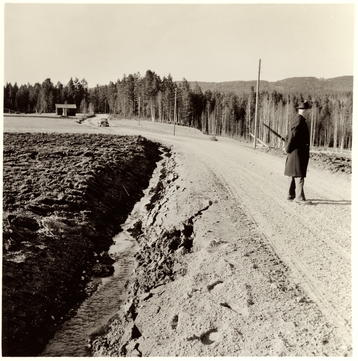 Vägskador från tjällossning. Dike. Väg 870 Rönndalen - Lembron vid Yttertänger. Idag riksväg 50.