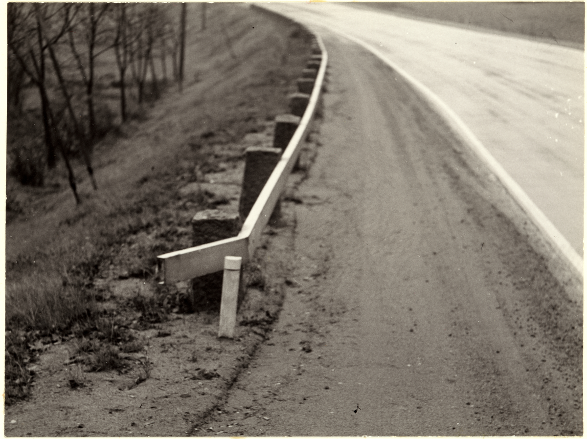 Oskadat vägräcke med stengardister utmed riksväg 10 (Rikstian) vid Gruvriset, Falun. Asfaltsväg. Idag Tunavägen längsmed E16.