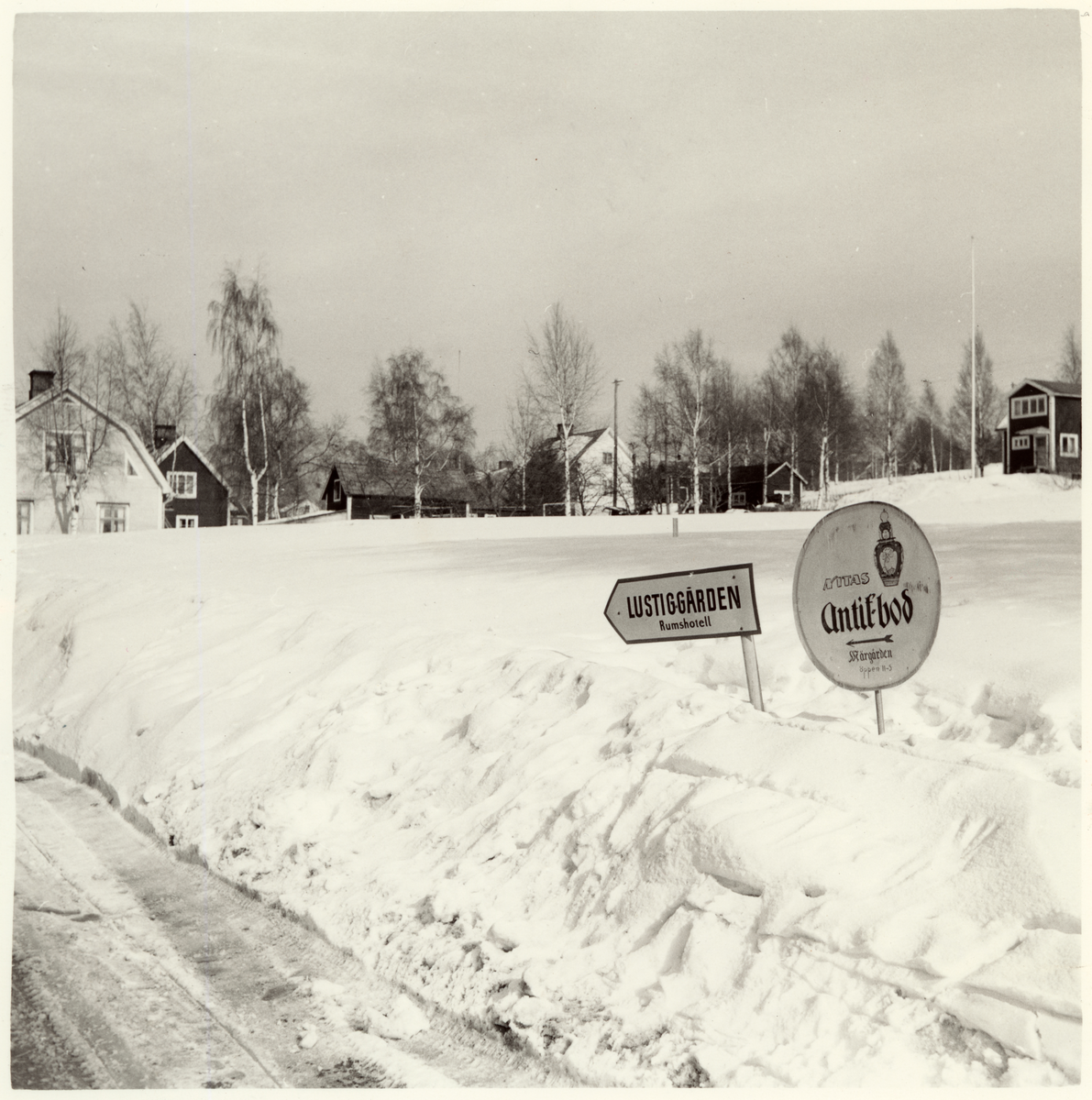 Vägskyltar mot hotell Lustiggården och antikbod. Snö. Länsväg 956 Dalarnas län.