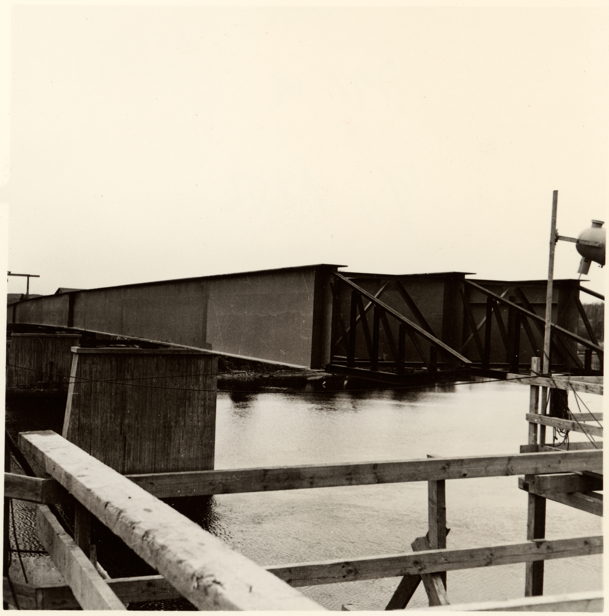 Byggande av bro. Balkar utdragna över stöd 5, 4 och 3. Riksväg 69.