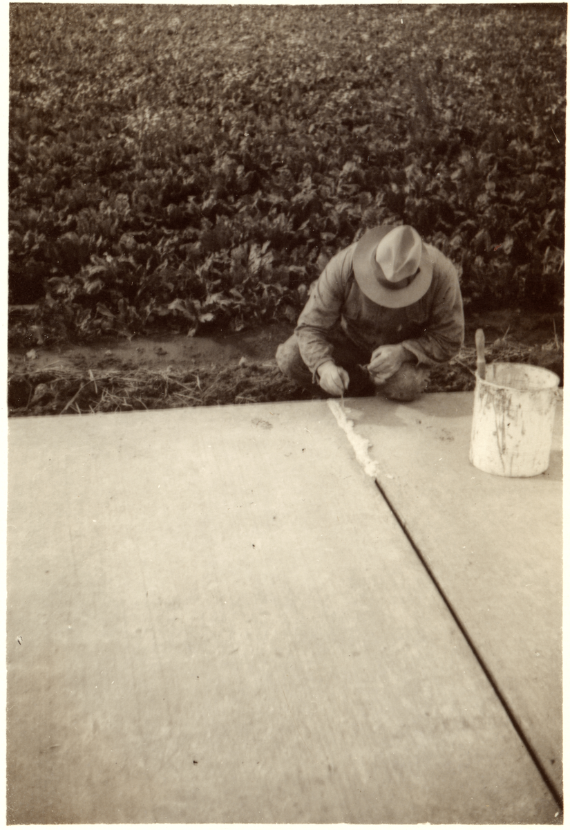 Prov med gummimjölk som fogfyllning mellan betongplattor. Idag Länsväg 102.