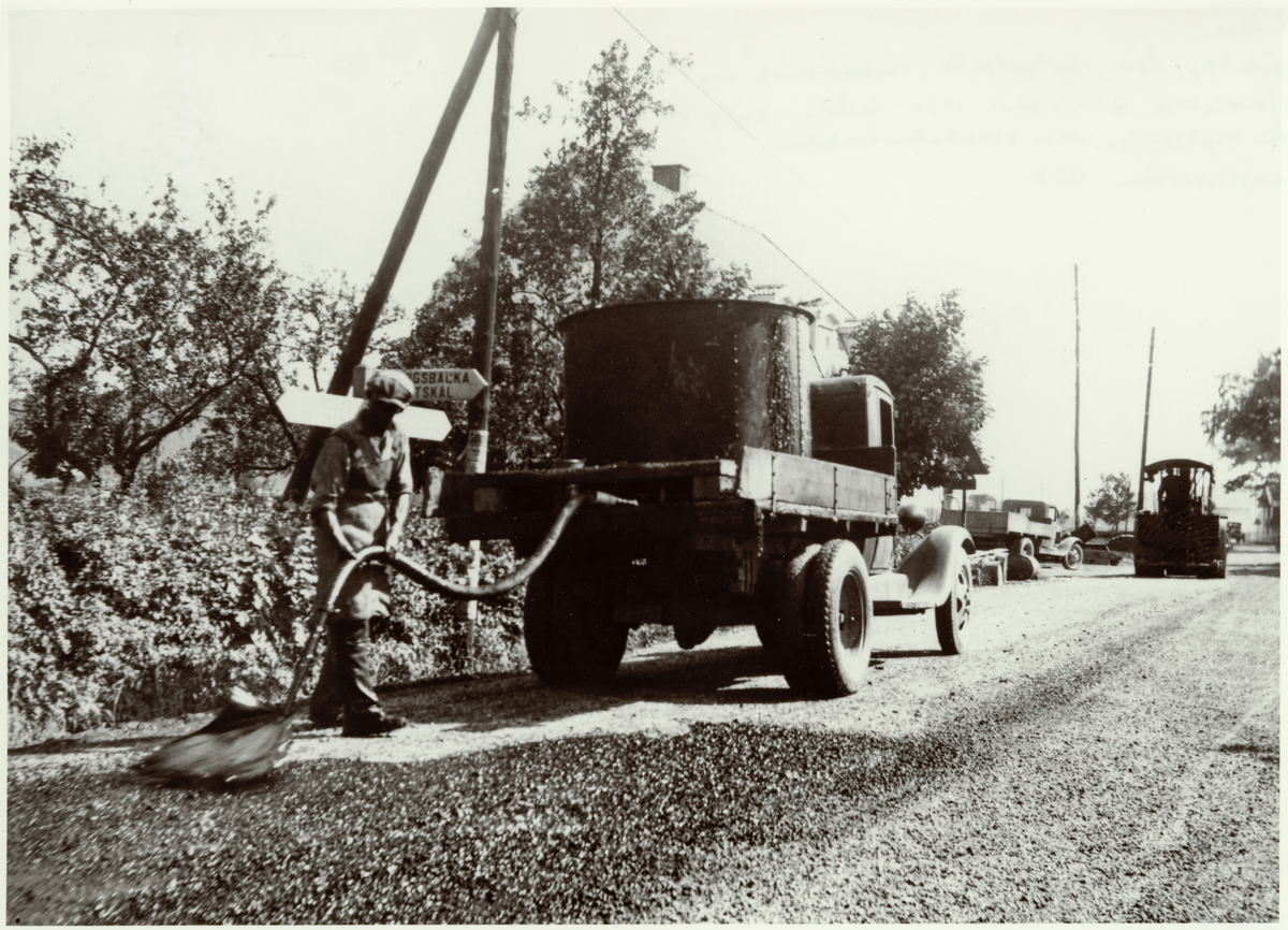 Asfaltemulsionen sprids från cistern, placerad på lastbilsflak.