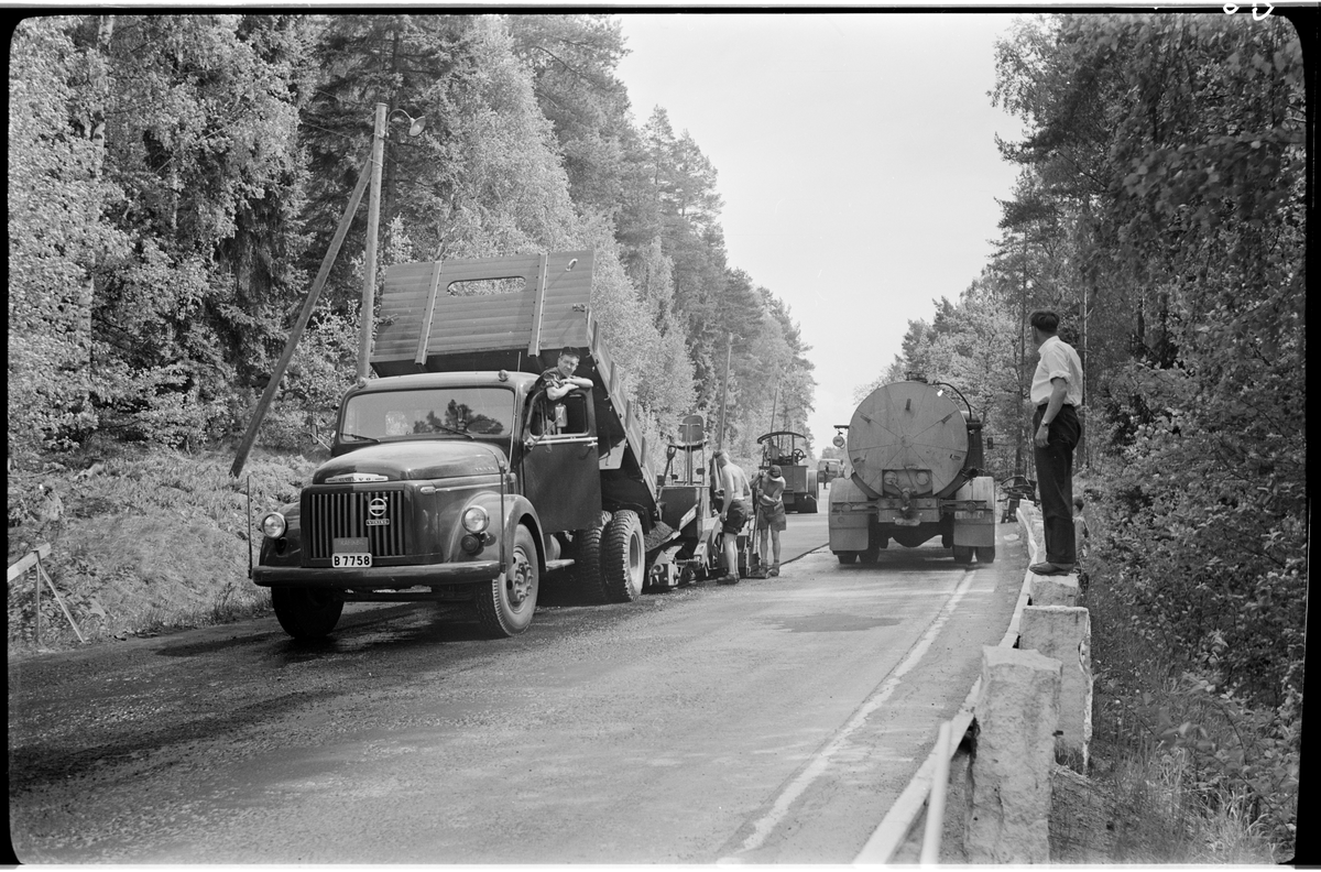 Beläggningsarbete, asfaltering på Enköpingsvägen. Vägräcke med stengardister till höger. Eventuellt dagens länsväg 841 Stockholms län, eller längs E18.