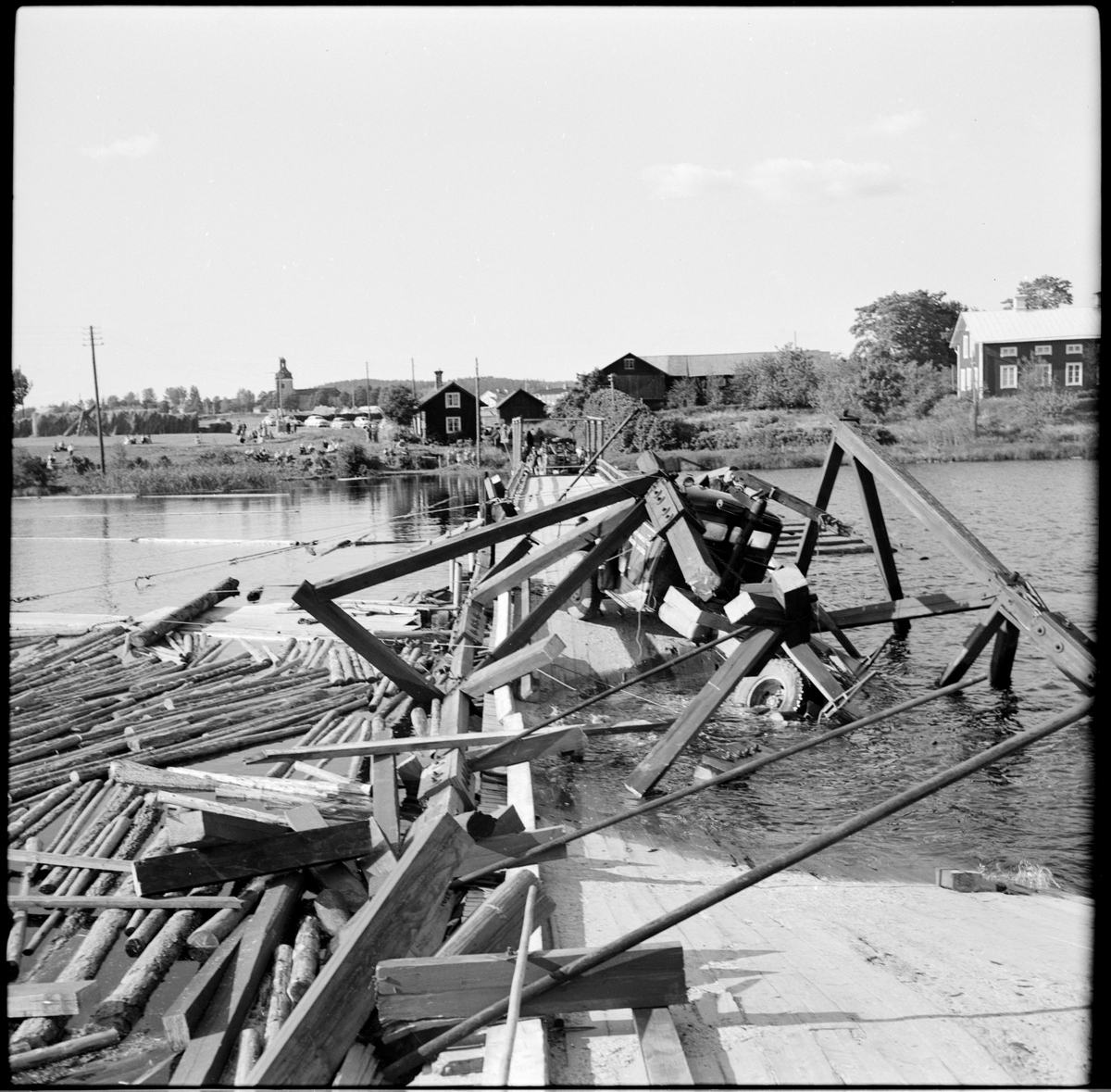 Träbro över Dalälven vid Landa. Flottbro (pontonbro). Sönderkörd av långtradare. Vy från söder. Stora Skedvi kyrka i bakgrunden. Idag länsväg 785 Dalarnas län.
