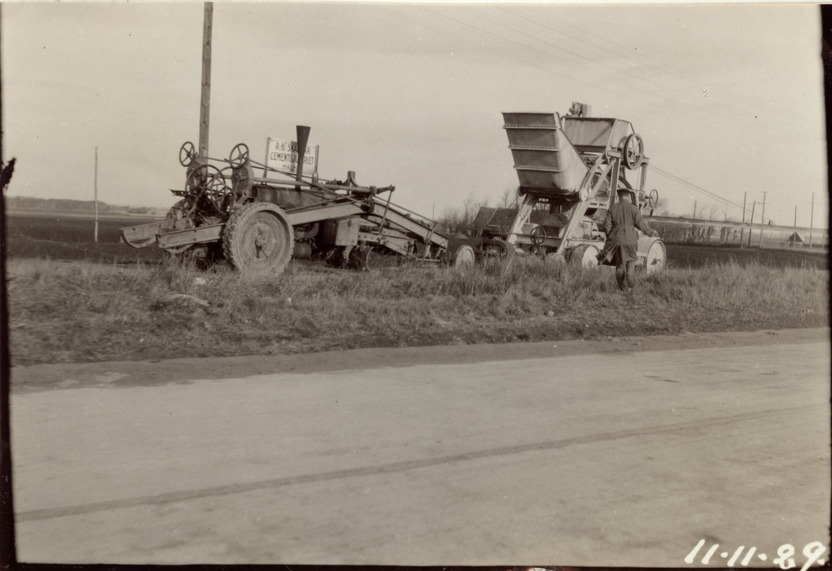Vägbeläggningsmaskiner. "'Vila' efter fyllt värv." AB Skånska Cementgjuteriet Petersfält/Skottorp (Skummeslöv). Idag Länsväg 585 Hallands län.