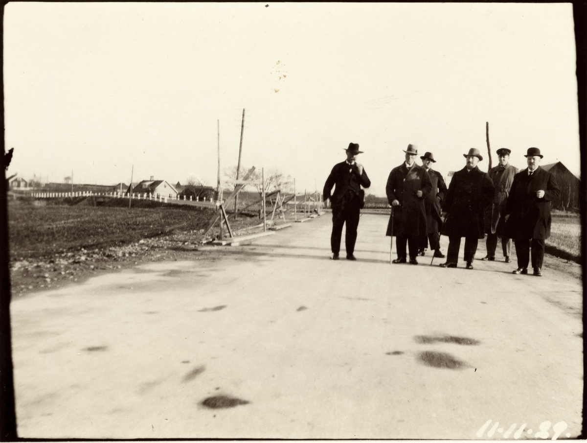Höks härads vägstyrelse synar vägen. Cementbetong. Petersfält/Skottorp (Skummeslöv). I bakgrunden vägbro med vägräcken med stengardister. Sannolikt Smedjebron, över Smedjeån. Idag Länsväg 585 Hallands län.