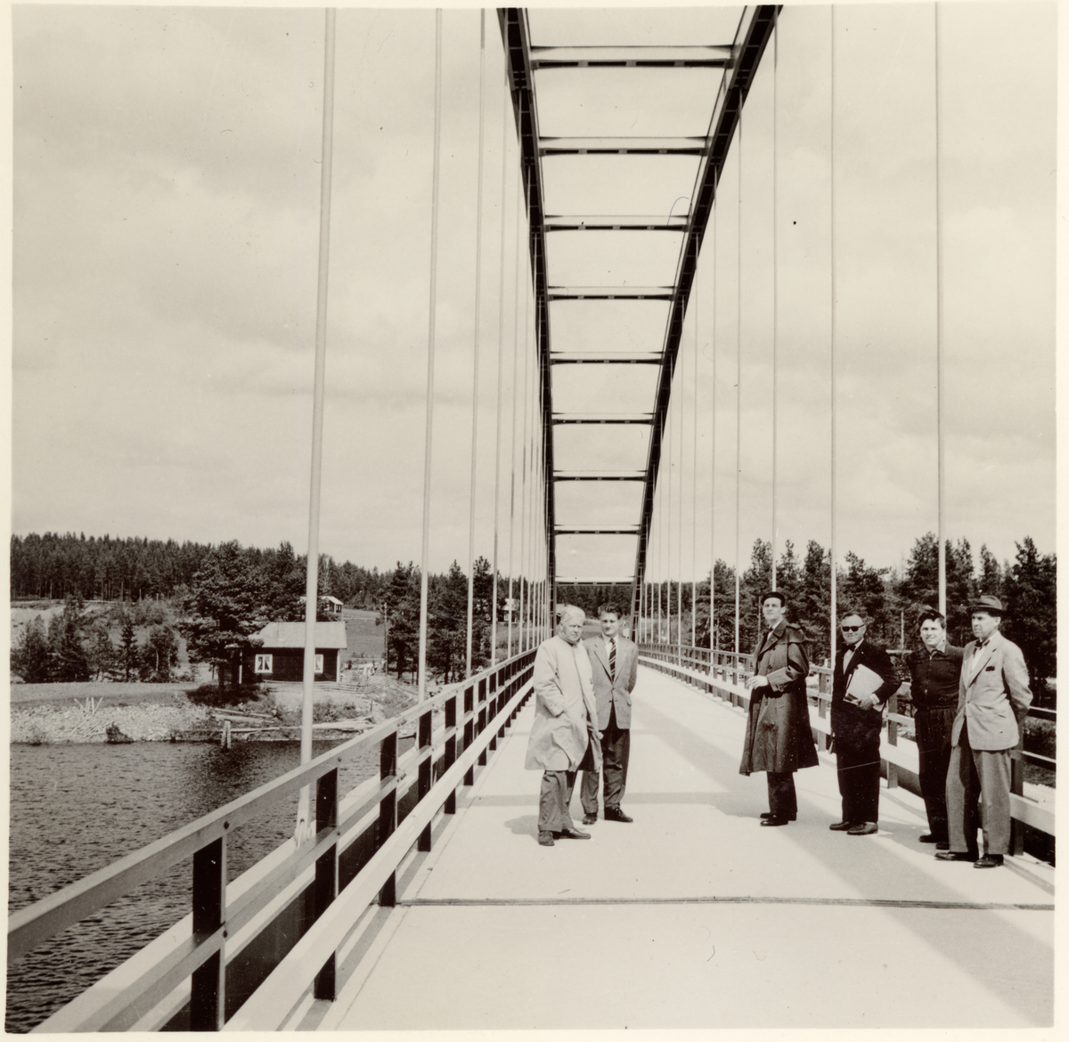 Bågbro över Särnsjön. Länsväg 1061 Dalarnas län. Från vänster: Arkitektchef Edvard Westerlund, ..., Byrådiriktör William Nilsson, Charles Holm, ..., Ingenjör S. [svårtolkat namn].