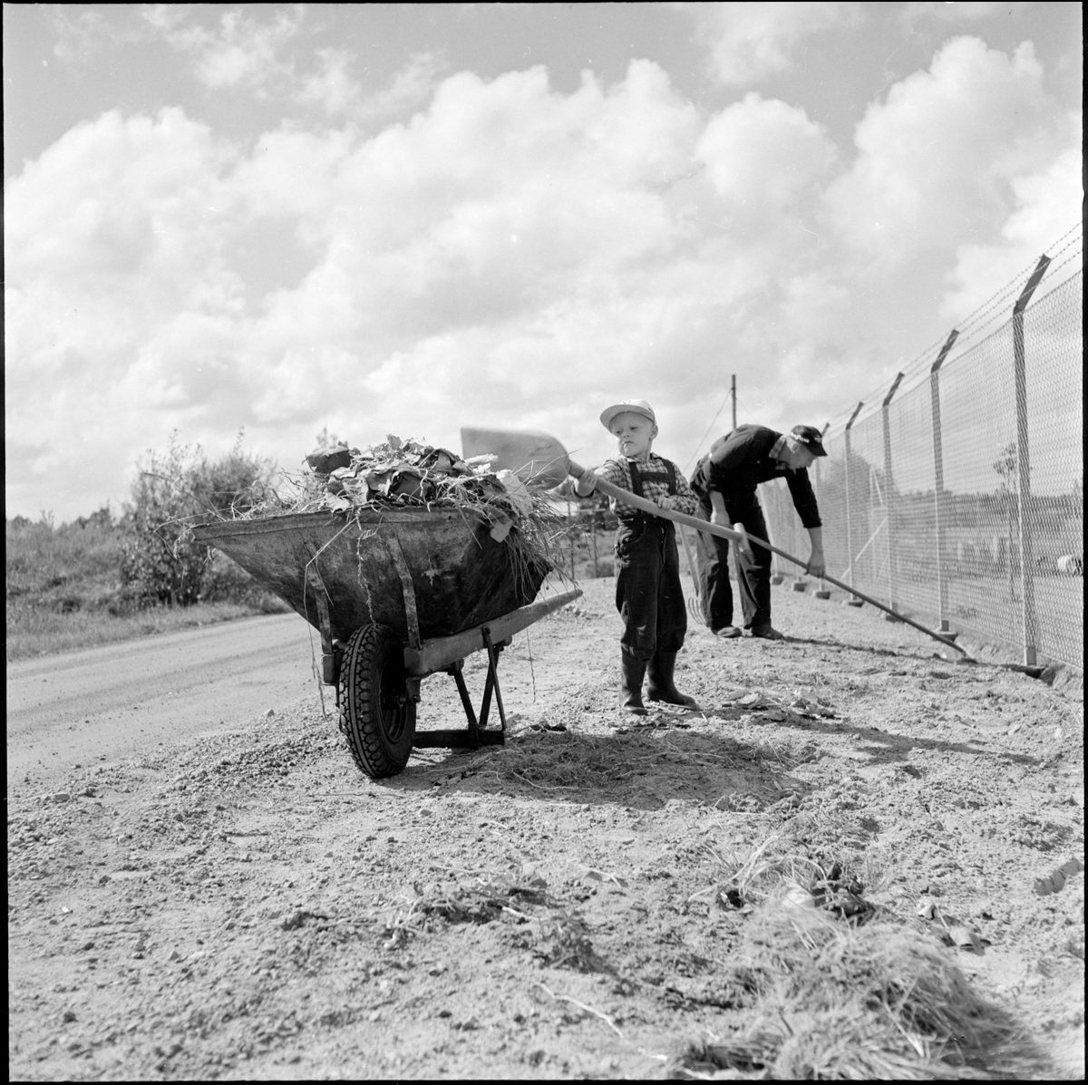 Liten pojke hjälper till och rensar upp vid vägkanten. Knutby vägstation.