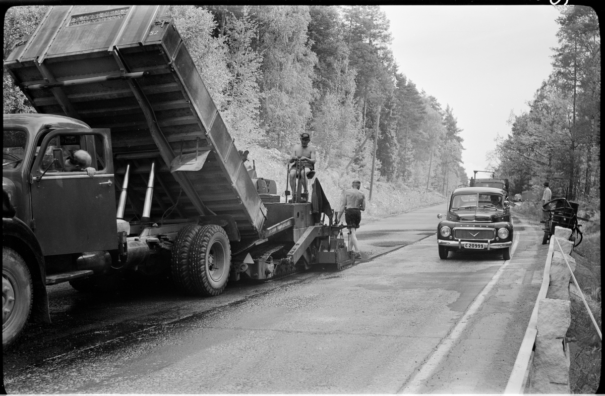 Beläggningsarbete, asfaltering på Enköpingsvägen. Vägräcke med stengardister till höger. Eventuellt dagens länsväg 841 Stockholms län, eller längs E18.