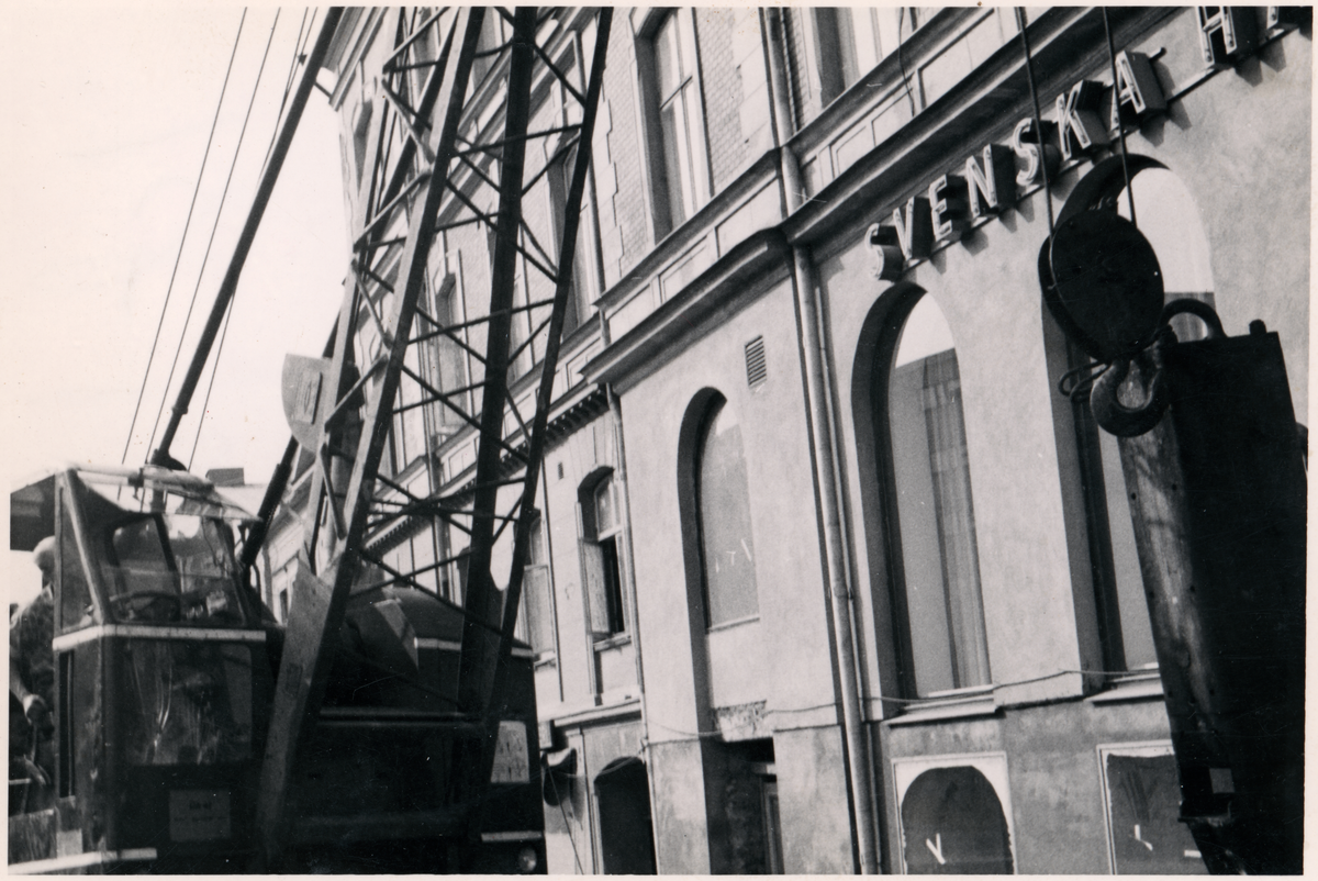 Kran lyfter stålbalk. Drottninggatan - Rudbecksgatan.