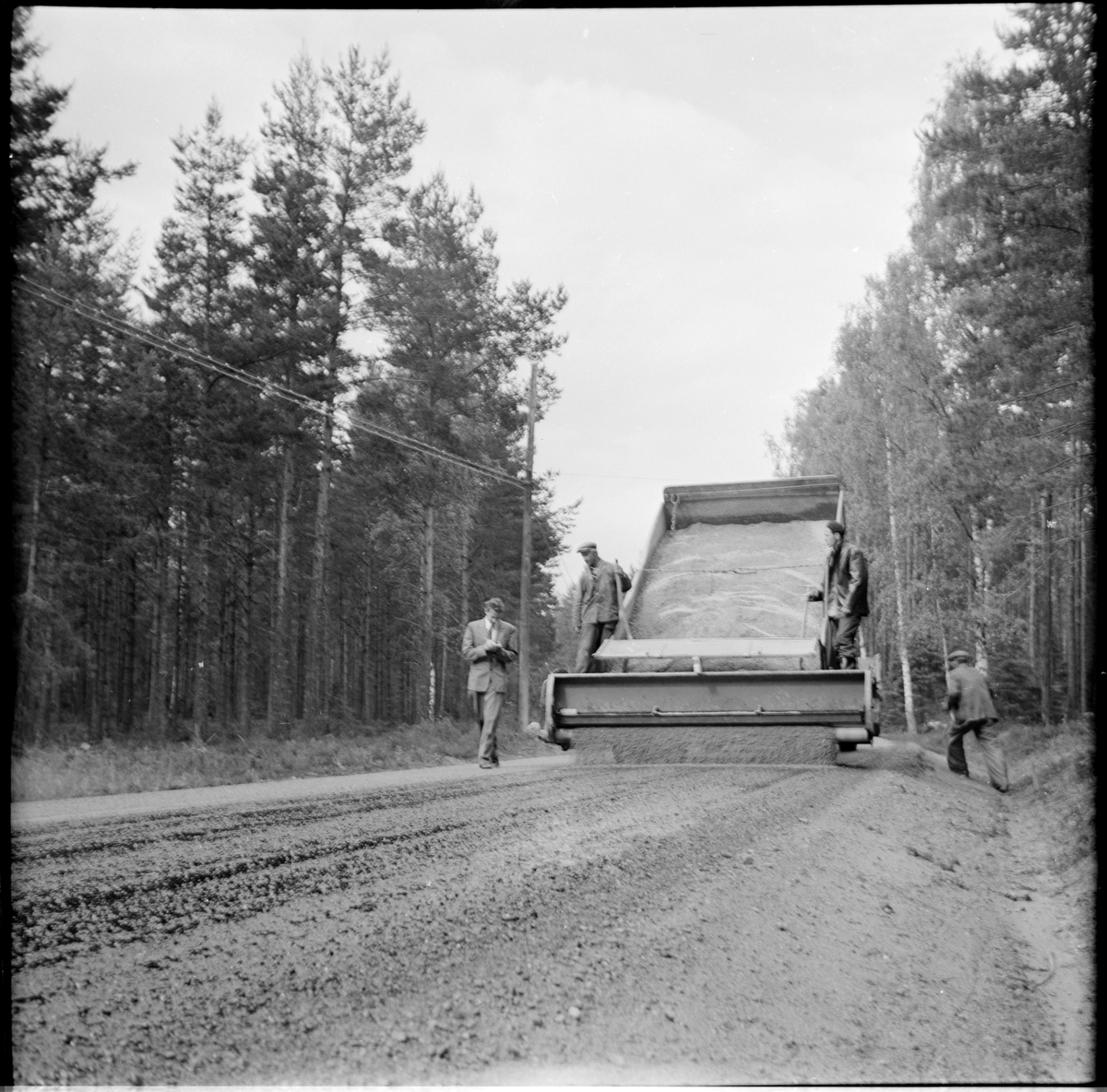 Utläggninga av pågrus för vägbeläggning av oljegrus.