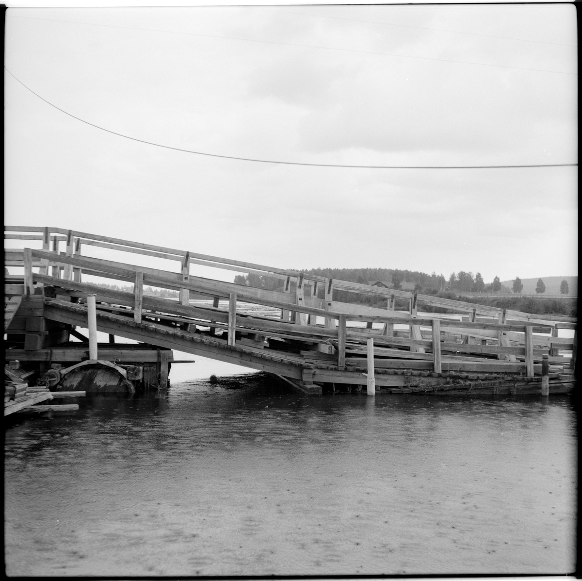 Träbro över Dalälven vid Landa. Flottbro (pontonbro). Sönderkörd av långtradare. Södra uppfarten. Idag länsväg 785 Dalarnas län.