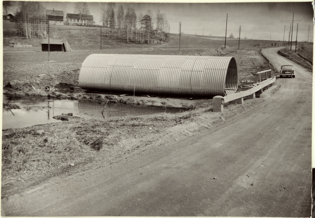 Arbete med ny vägtrumma (amerikansk modell). Vägräcke med stengardister. Länsväg 671 Dalarnas län, mellan Sjönsbo och Hedemora.