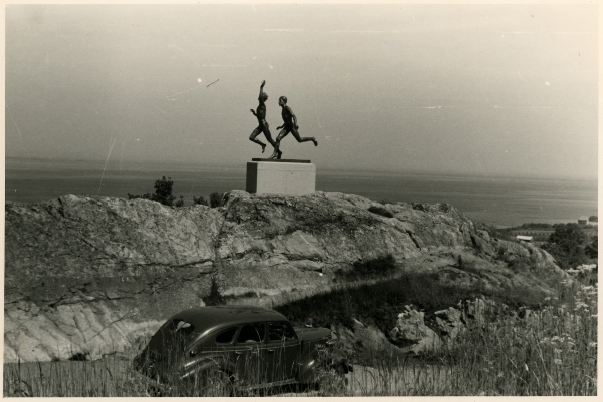 Skulptur "Löparna" gjord av Carl Eldh. Kopia av skulptur vid Stockholm stadion. Kråkberget, vid Galgen, mellan Gränna och Gyllene Uttern. Utsikt över Vättern. Länsväg 993 Jönköpings län. Invid E4.