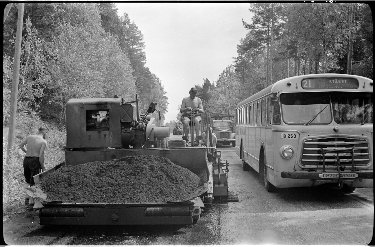 Beläggningsarbete, asfaltering på Enköpingsvägen, Stockholm - Enköping. Eventuellt dagens länsväg 841 Stockholms län, eller längs E18.
