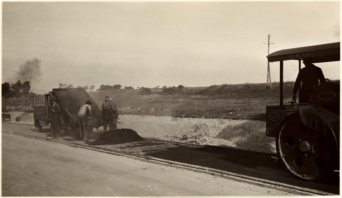 Utläggning och vältning av sandasfaltlagret. Malmö - Göteborg, söder om Fyllebro. Sannolikt sträckan Fyllingebro - Kistinge. Idag Riksväg 15.