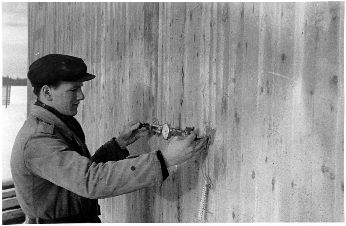 Vägbro över Hammerdalssundet. Mätning av spricka i kasunen under uppförandet av bron.