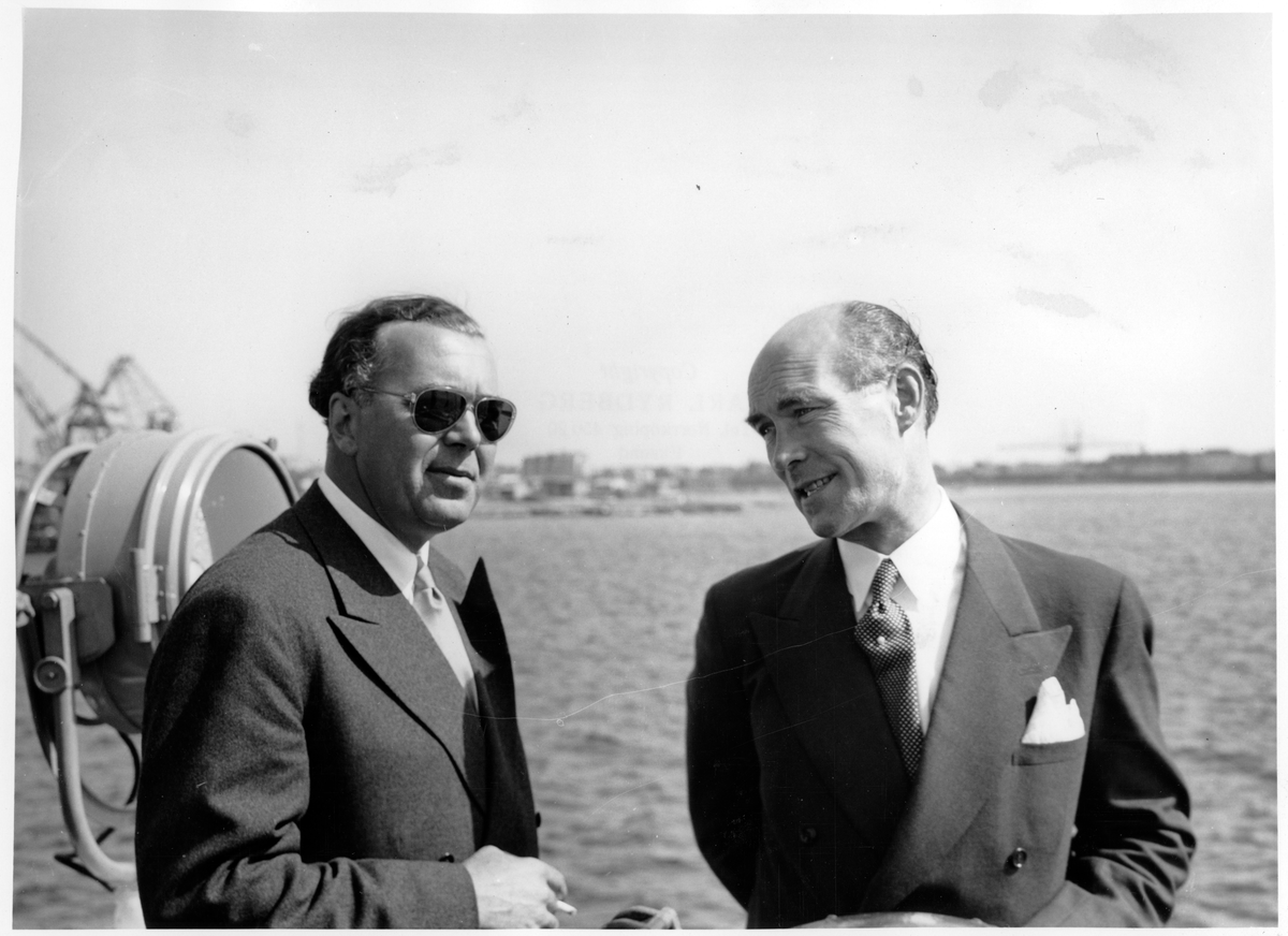 Invigning av vägbro mellan Bergnäset och Luleå. Hans Kungliga Höghet Prins Bertil till vänster konverserar med Landshövding F. Thunborg på en båt under invigningen.