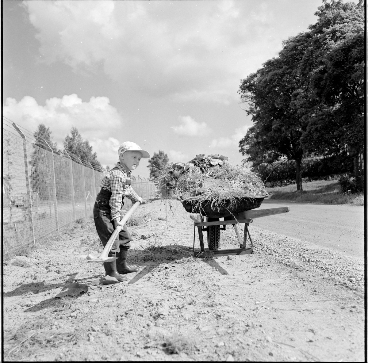 Liten pojke hjälper till med att rensa upp längsvägkanten. Knutby vägstation.