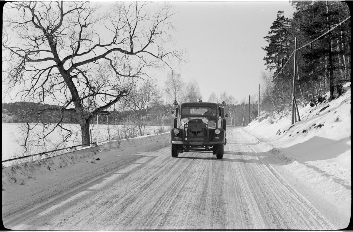 Lastbil på vinterväg. Scania-Vabis. Vägskylt: "Fornminne 400m, gravröse". Stockholms län.