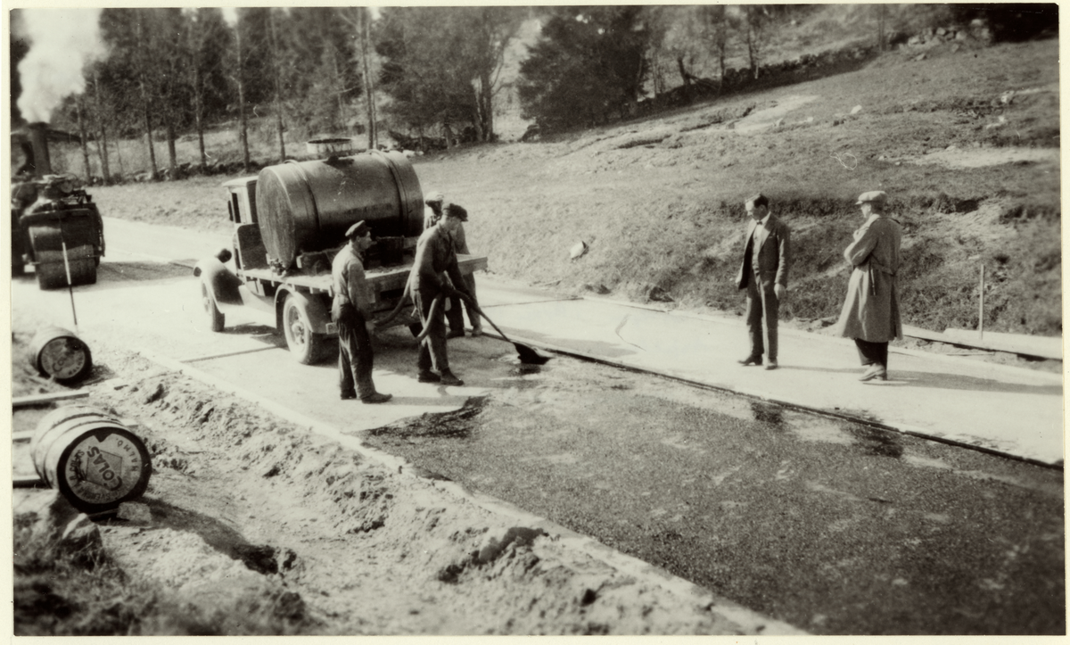 Asfaltemulsion sprides från tankbil. Bitaminös beläggning.