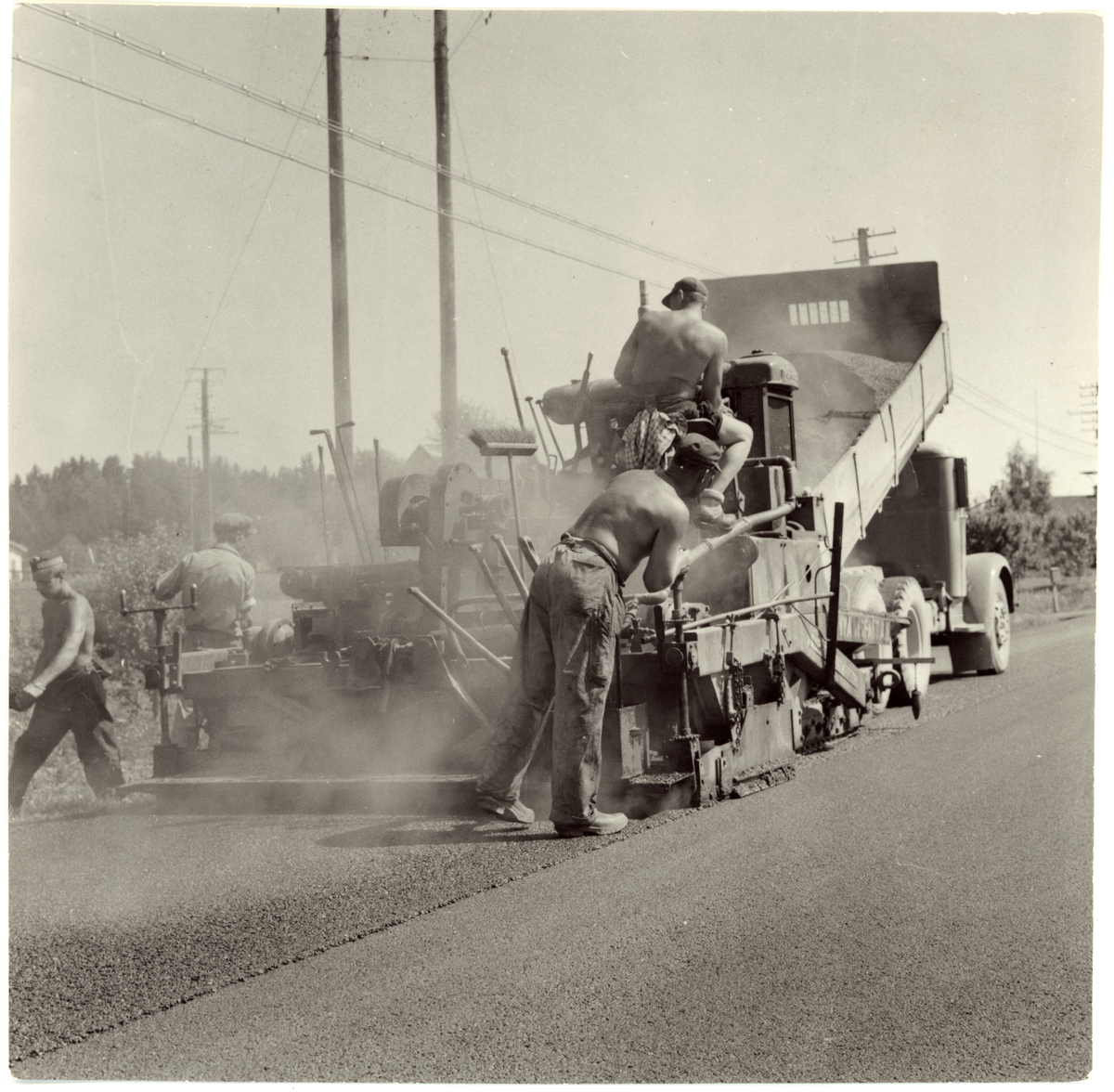 Utläggningsmaskin Barber-Greene. Riksväg 12. Idag E18.