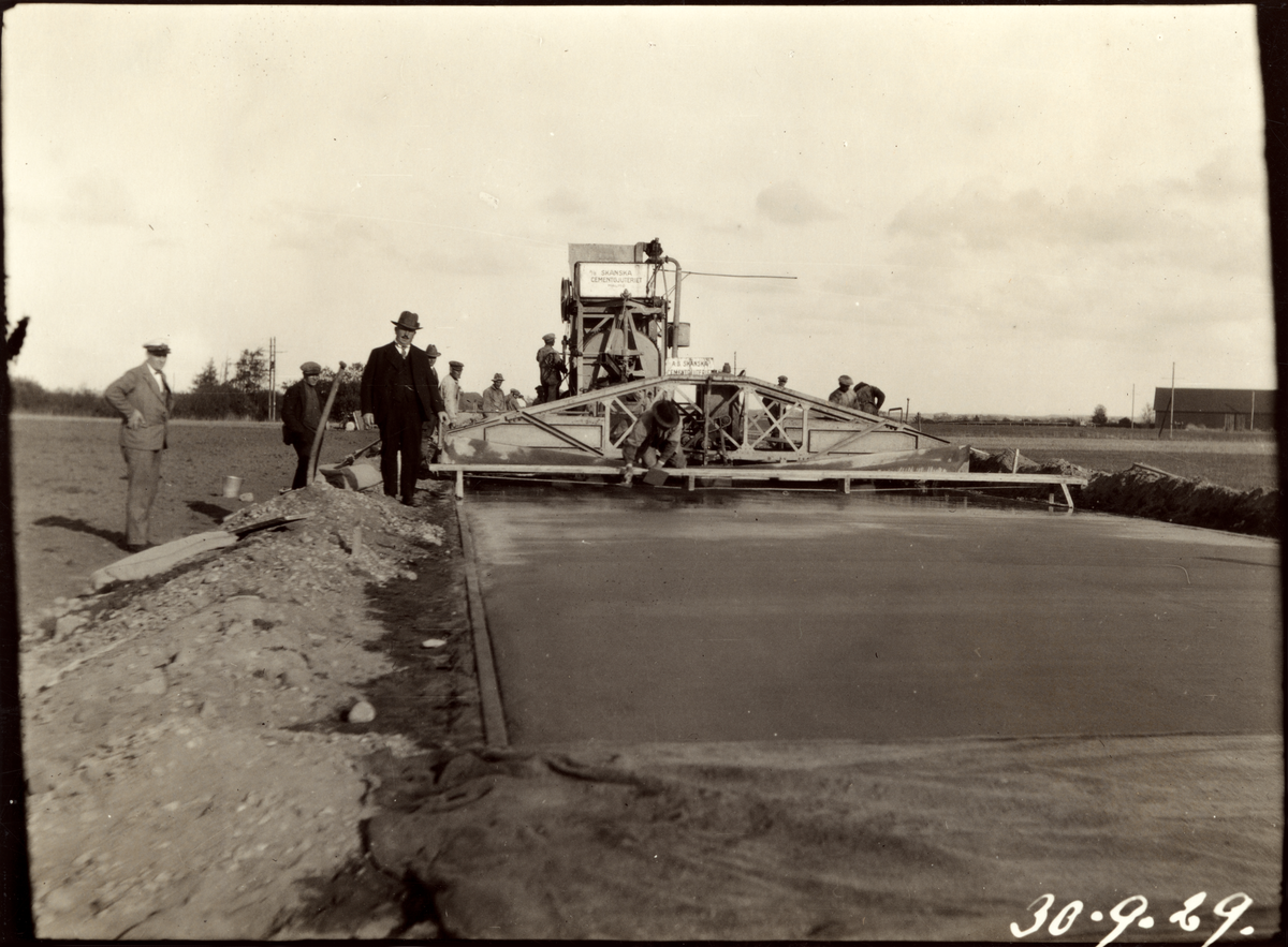 Betonggjutning av väg. Malmö - Göteborg, vid Petersfält/Skottorp (Skummeslöv). Cementbetong. AB Skånska Cementgjuteriet. Idag Länsväg 585 Hallands län.