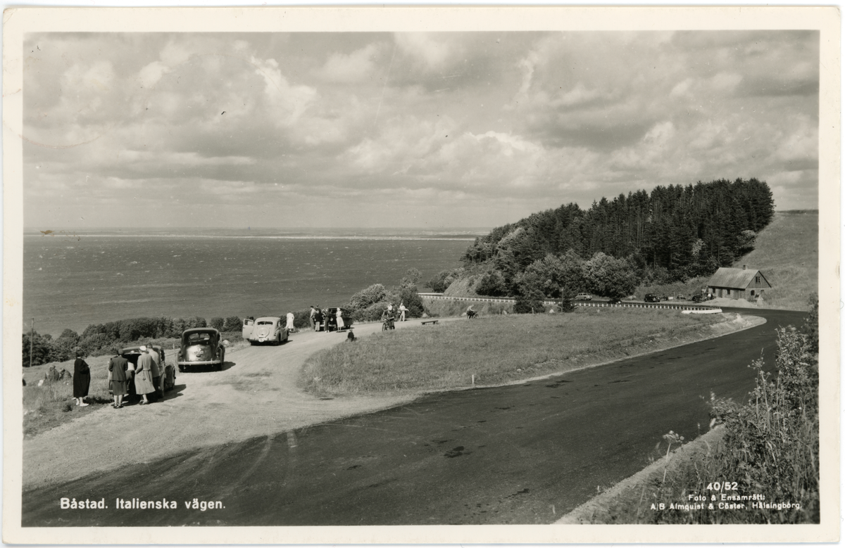 Vykort över rastplats vid Italienska vägen, riksväg 115. Utsikt över vattnet.