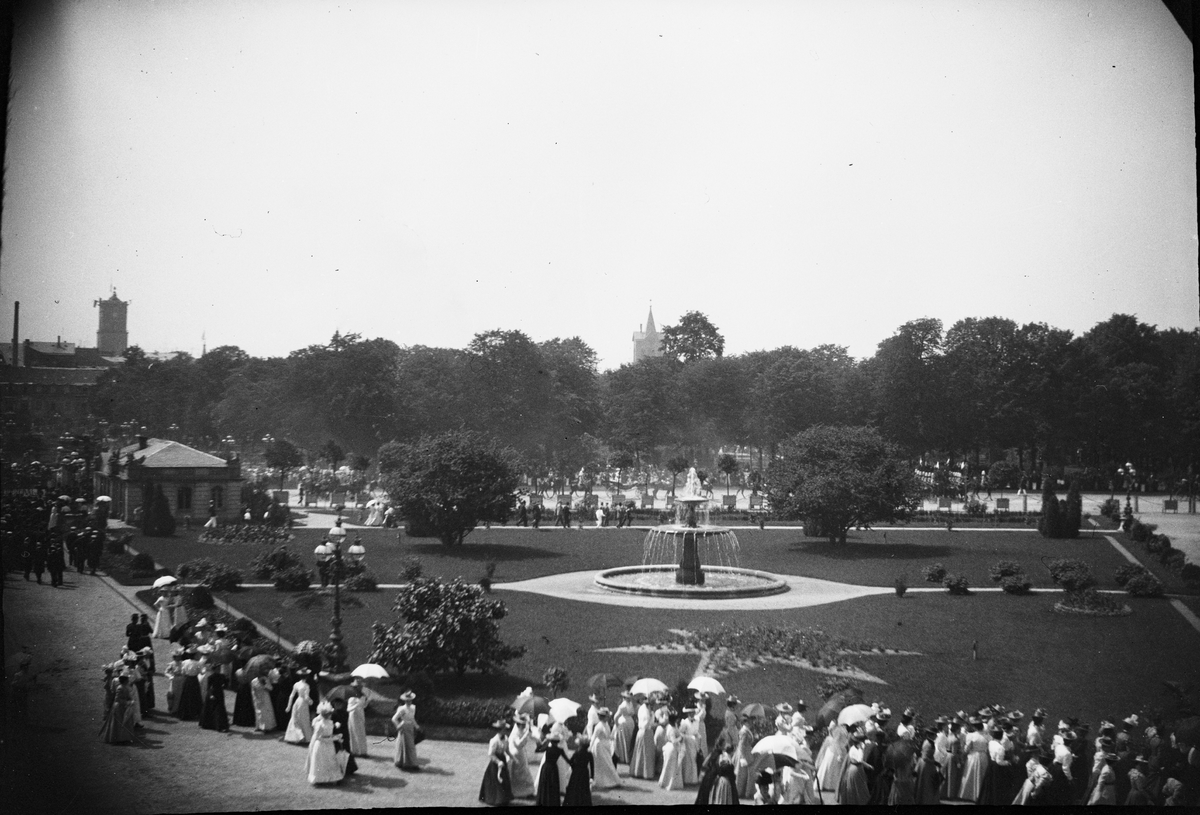 Drottning Victorias bilder. Vy över park med monument. Troligen Karlsruhe, Tyskland.