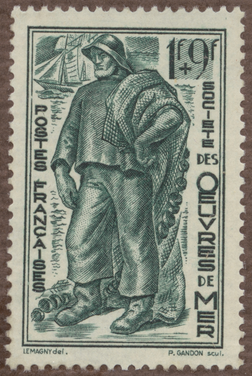 Frimärke från Frankrike, 1941. Motiv av Fransk fiskare Till förmån för franska sjöfolk-