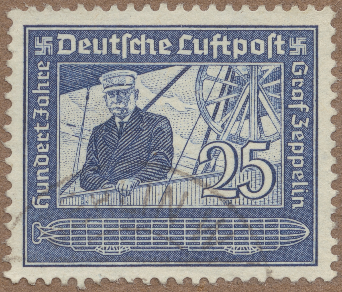 Frimärke från Tyskland, 1938. Motiv av Graf Zeppelin i gondolen till en tidig Zeppelinare. "-100-årsminne av Zeppelins födelse: 1838- 1938."